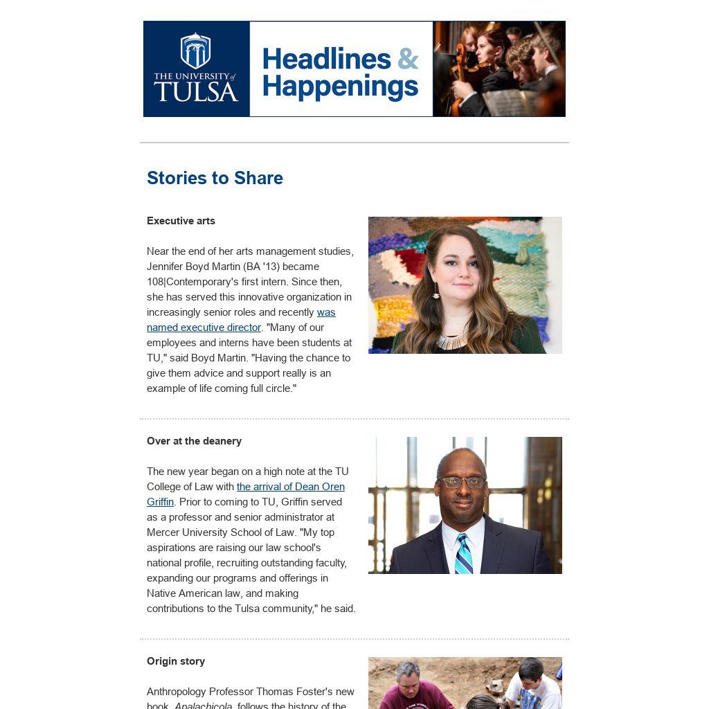 Near the end of her arts management studies, Jennifer Boyd Martin (BA '13) became 108|Contemporary's first intern. Since then, she has served this innovative organization in increasingly senior roles and recently was named executive director. "Many of our employees and interns have been students at TU," said Boyd Martin. "Having the chance to give them advice and support really is an example of life coming full circle."