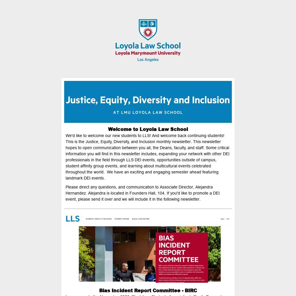 We'd like to welcome our new students to LLS! And welcome back continuing students! This is the Justice, Equity, Diversity, and Inclusion monthly newsletter. This newsletter hopes to open communication between you all, the Deans, faculty, and staff. Some critical information you will find in this newsletter includes, expanding your network with other DEI professionals in the field through LLS DEI events, opportunities outside of campus, student affinity group events, and learning about multicultural events celebrated throughout the world. We have an exciting and engaging semester ahead featuring landmark DEI events.
