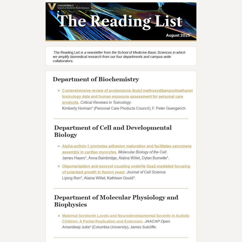 The Reading List is a newsletter from the School of Medicine Basic Sciences in which we amplify biomedical research from our four departments and campus-wide collaborators.