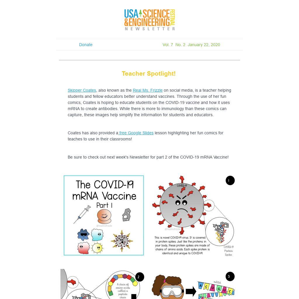 Skipper Coates, also known as the Real Ms. Frizzle on social media, is a teacher helping students and fellow educators better understand vaccines. Through the use of her fun comics, Coates is hoping to educate students on the COVID-19 vaccine and how it uses mRNA to create antibodies. While there is more to immunology than these comics can capture, these images help simplify the information for students and educators.