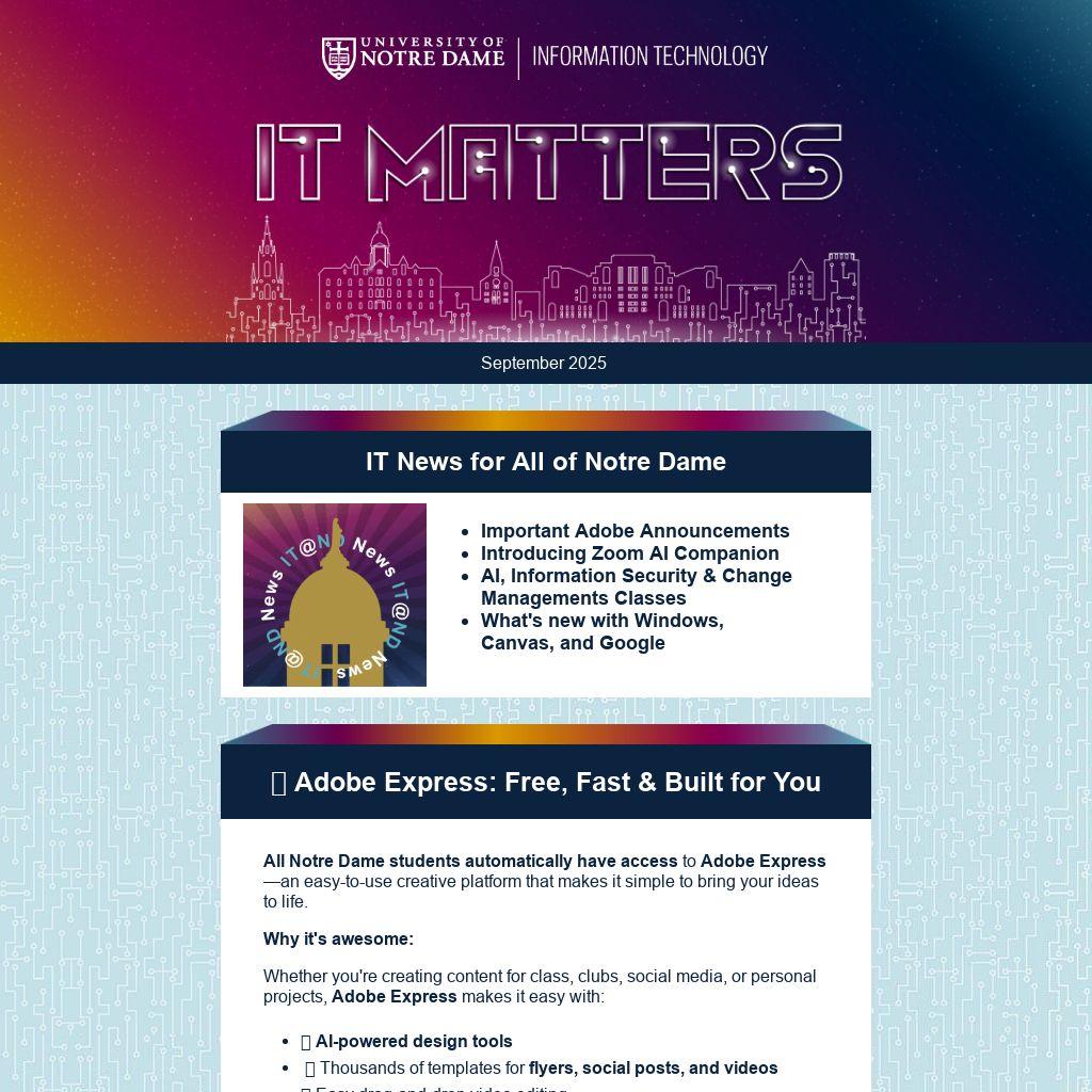All Notre Dame students automatically have access to Adobe Express—an easy-to-use creative platform that makes it simple to bring your ideas to life.