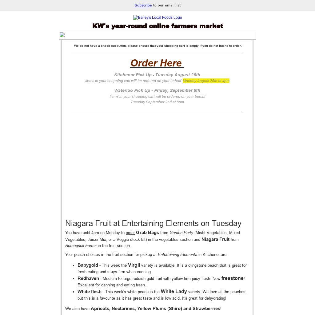 You have until 4pm on Monday to order Grab Bags from Garden Party (Misfit Vegetables, Mixed Vegetables, Juicer Mix, or a Veggie stock kit) in the vegetables section and Niagara Fruit from Romagnoli Farms in the fruit section.