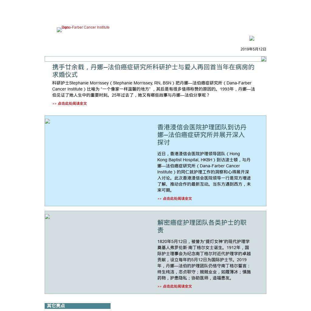 1820年5月12日,被誉为“提灯女神”的现代护理学奠基人弗罗伦斯·南丁格尔女士诞生。1912年,国际护士理事会为纪念南丁格尔对近代护理学的卓越贡献,设立每年的5月12日为国际护士节。2019年,丹娜—法伯的护理团队仍恪守南丁格尔誓言:终生纯洁,忠贞职守;兢兢业业,如履薄冰;慎施药物,护患隐私;协助医师,造福患友。