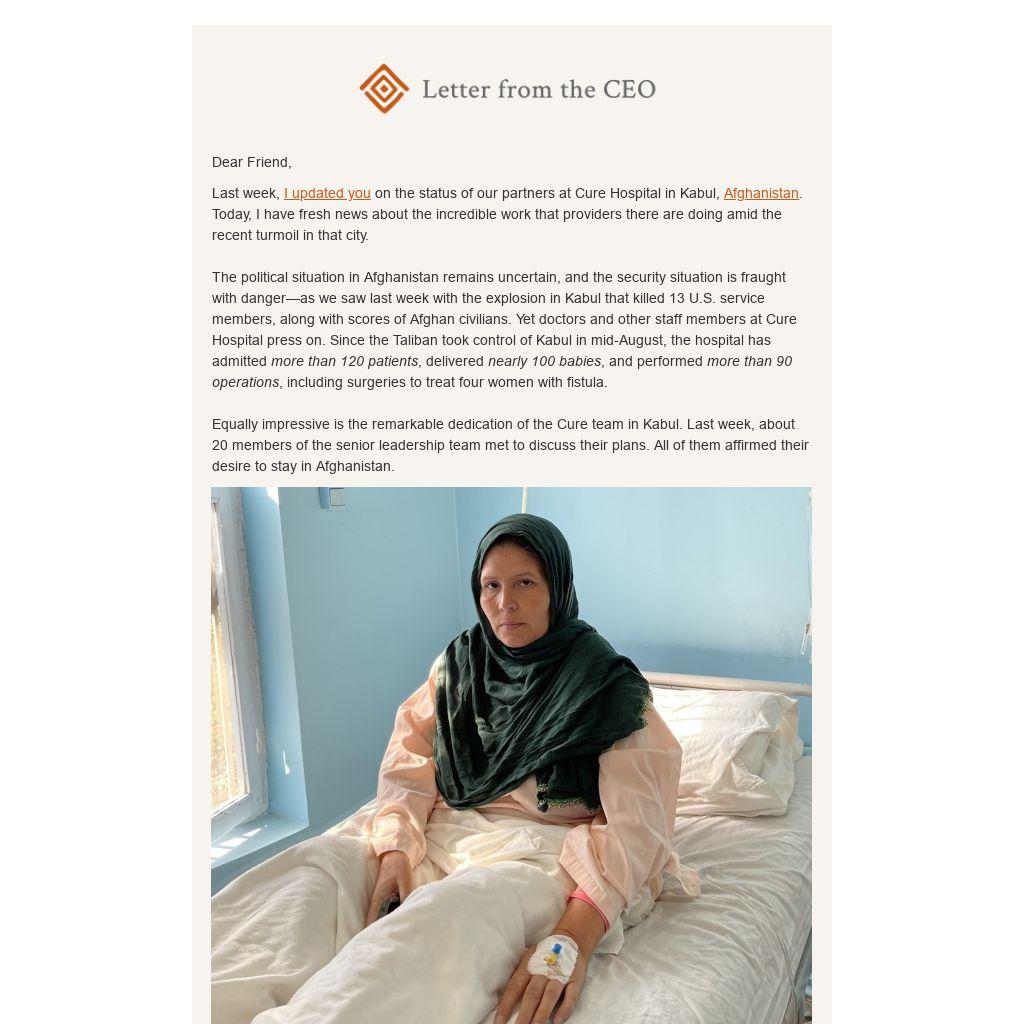 I am hopeful that leaders of the new government will recognize the value of allowing doctors to continue performing fistula repair surgeries and other life-changing procedures. I am also enormously thankful to you for helping us preserve a lifeline of support for patients like Bibigul and surgeons like Dr. Dost.