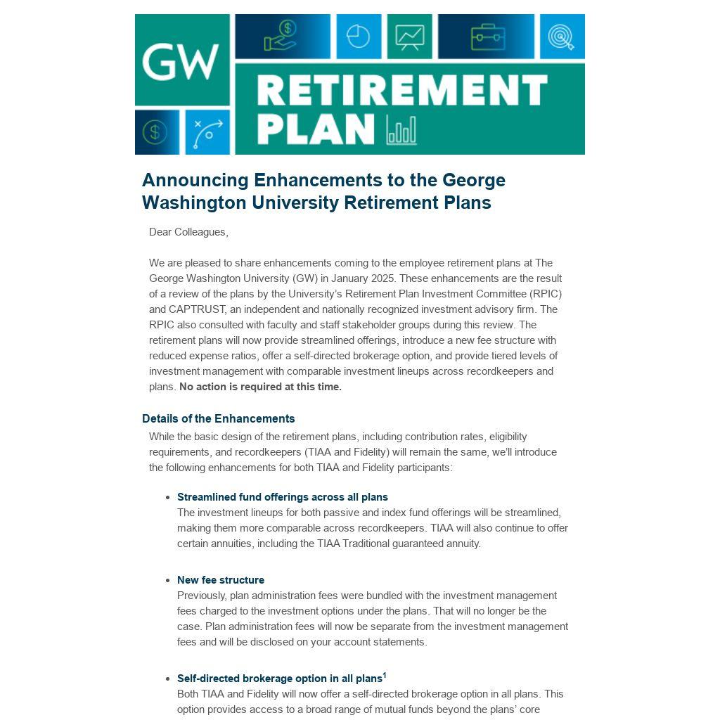We are pleased to share enhancements coming to the employee retirement plans at The George Washington University (GW) in January 2025. These enhancements are the result of a review of the plans by the University’s Retirement Plan Investment Committee (RPIC) and CAPTRUST, an independent and nationally recognized investment advisory firm. The RPIC also consulted with faculty and staff stakeholder groups during this review. The retirement plans will now provide streamlined offerings, introduce a new fee structure with reduced expense ratios, offer a self-directed brokerage option, and provide tiered levels of investment management with comparable investment lineups across recordkeepers and plans. No action is required at this time.