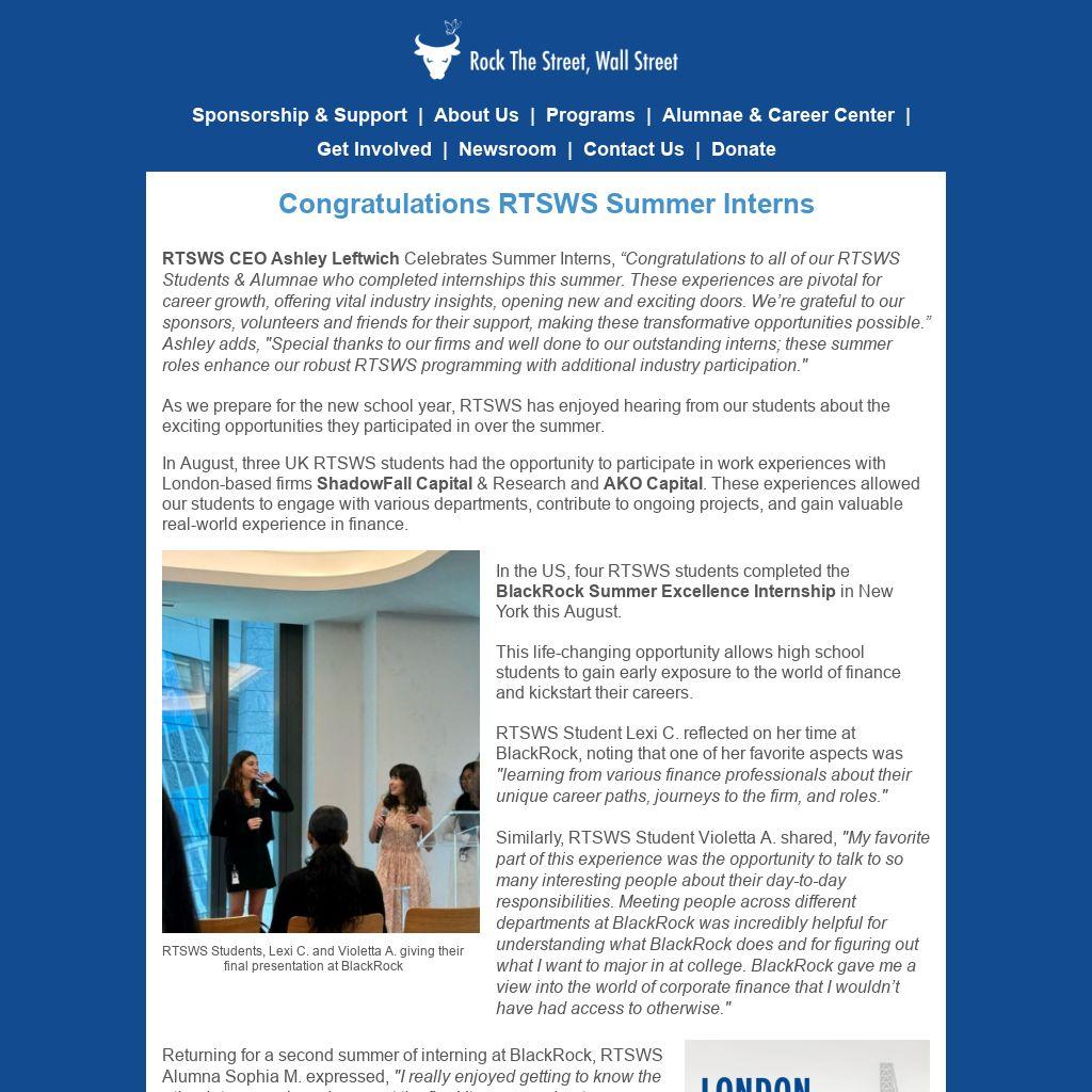 RTSWS CEO Ashley Leftwich Celebrates Summer Interns, “Congratulations to all of our RTSWS Students & Alumnae who completed internships this summer. These experiences are pivotal for career growth, offering vital industry insights, opening new and exciting doors. We’re grateful to our sponsors, volunteers and friends for their support, making these transformative opportunities possible.” Ashley adds, "Special thanks to our firms and well done to our outstanding interns; these summer roles enhance our robust RTSWS programming with additional industry participation."