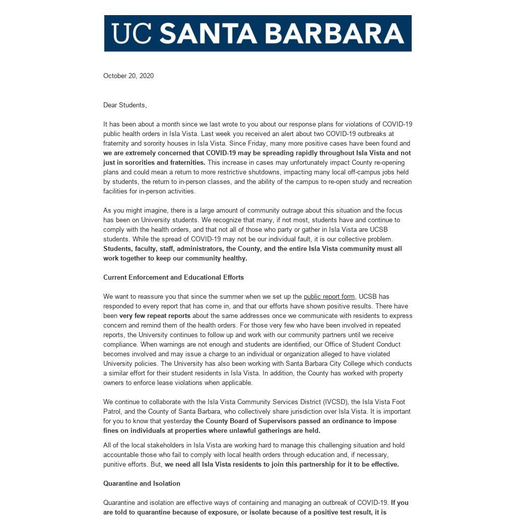It has been about a month since we last wrote to you about our response plans for violations of COVID-19 public health orders in Isla Vista. Last week you received an alert about two COVID-19 outbreaks at fraternity and sorority houses in Isla Vista. Since Friday, many more positive cases have been found and we are extremely concerned that COVID-19 may be spreading rapidly throughout Isla Vista and not just in sororities and fraternities. This increase in cases may unfortunately impact County re-opening plans and could mean a return to more restrictive shutdowns, impacting many local off-campus jobs held by students, the return to in-person classes, and the ability of the campus to re-open study and recreation facilities for in-person activities.