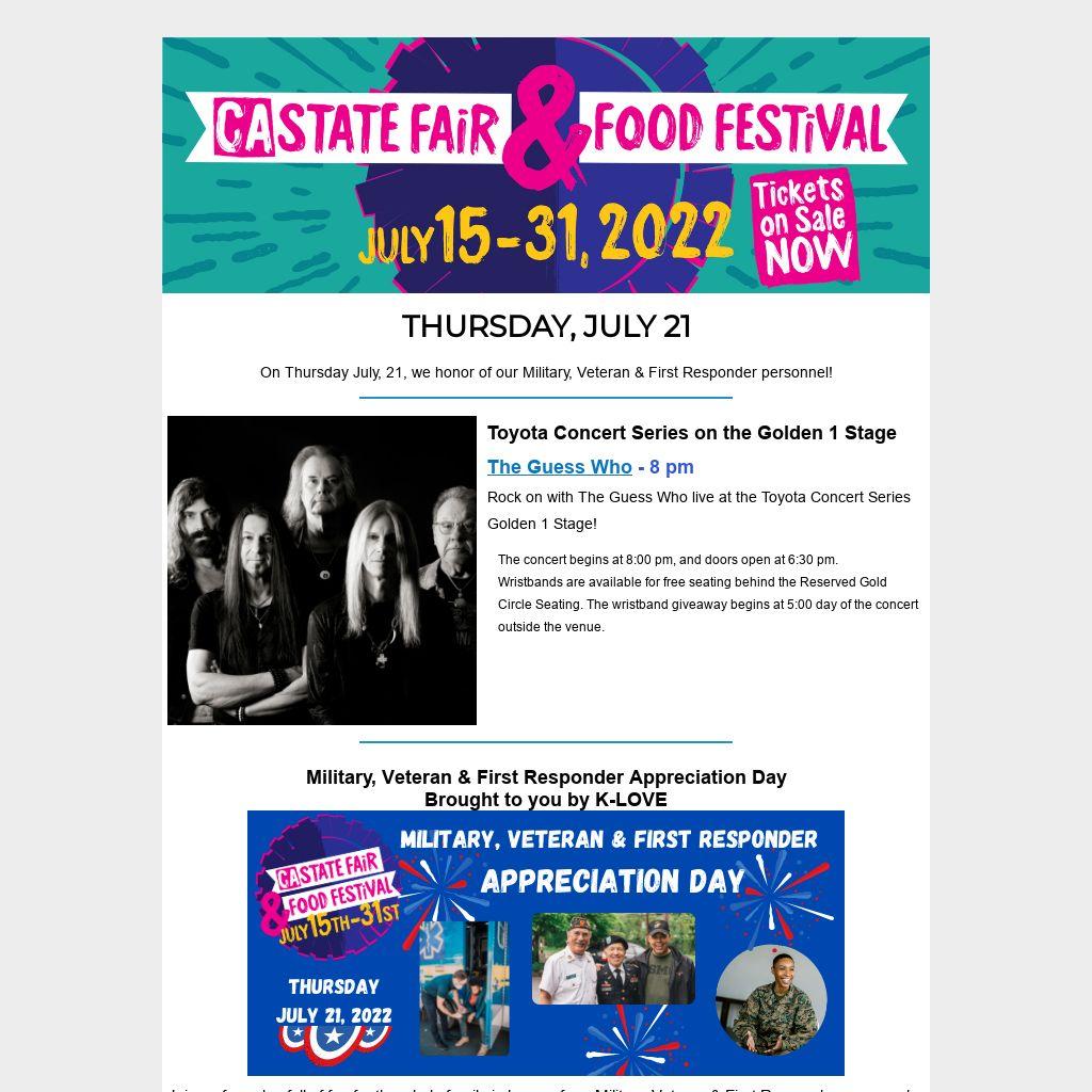 Join us for a day full of fun for the whole family in honor of our Military, Veteran & First Responder personnel, complete with special exhibits, interactive activities and entertainment. Guests will enjoy a Cooking 911 Cooking Challenge at the Save Mart California’s Kitchen, while representatives from military and first responder organizations will have special exhibits and provide valuable resources.