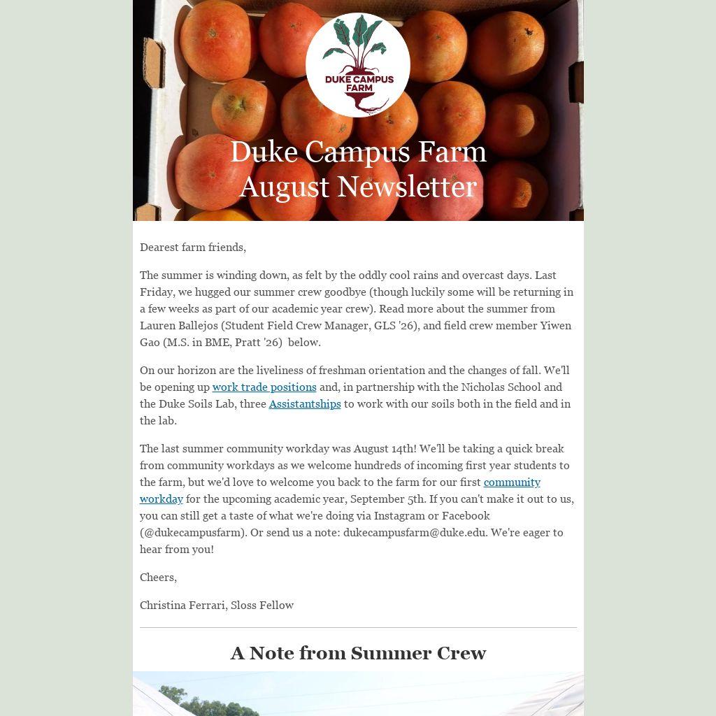 The last summer community workday was August 14th! We'll be taking a quick break from community workdays as we welcome hundreds of incoming first year students to the farm, but we'd love to welcome you back to the farm for our first community workday for the upcoming academic year, September 5th. If you can't make it out to us, you can still get a taste of what we're doing via Instagram or Facebook (@dukecampusfarm). Or send us a note: dukecampusfarm@duke.edu. We're eager to hear from you!