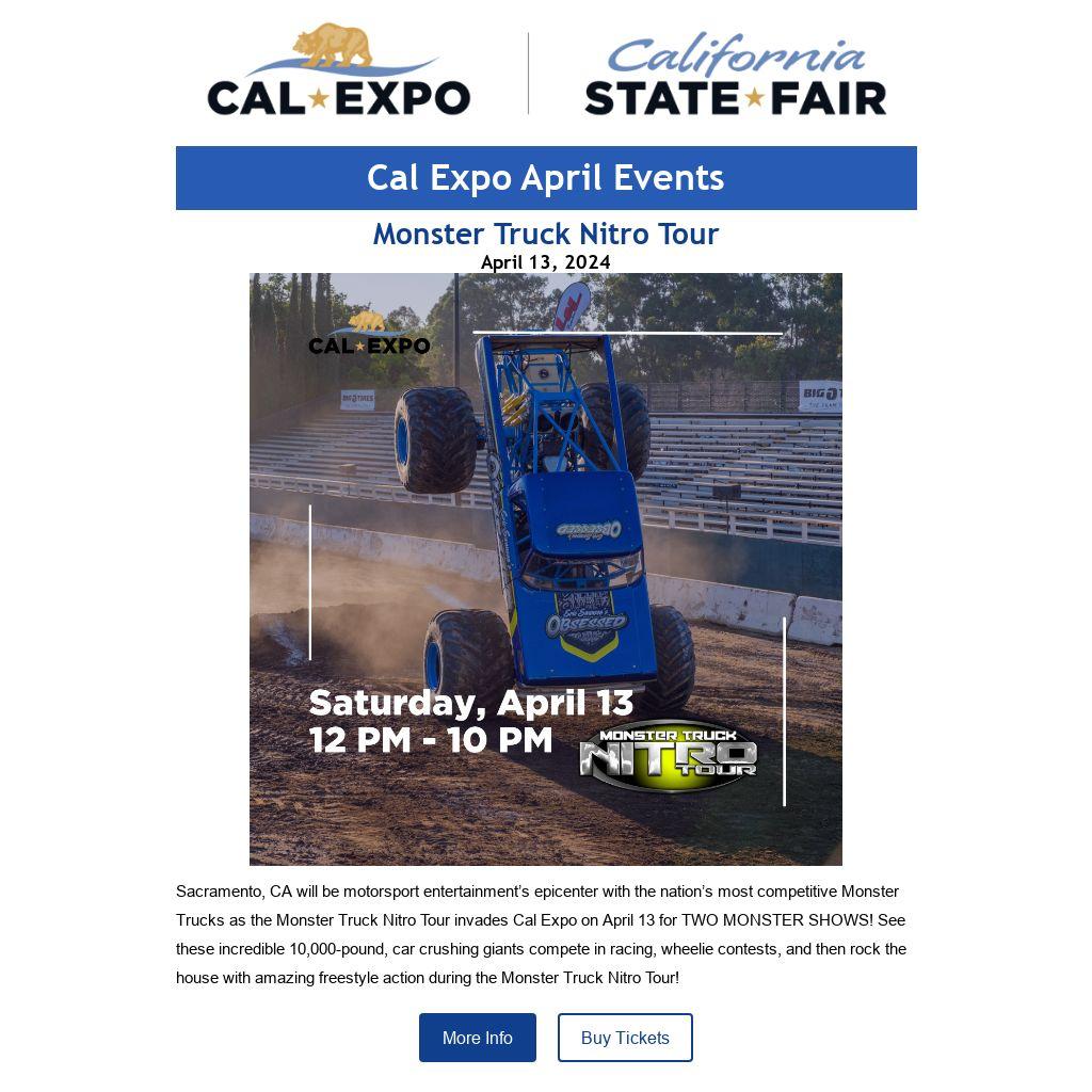 Sacramento, CA will be motorsport entertainment’s epicenter with the nation’s most competitive Monster Trucks as the Monster Truck Nitro Tour invades Cal Expo on April 13 for TWO MONSTER SHOWS! See these incredible 10,000-pound, car crushing giants compete in racing, wheelie contests, and then rock the house with amazing freestyle action during the Monster Truck Nitro Tour!