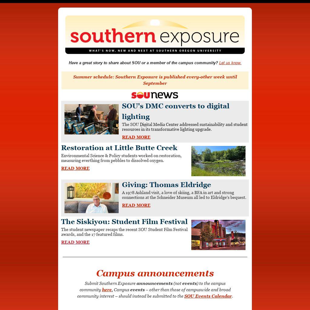 Submit Southern Exposure announcements (not events) to the campus community here. Campus events – other than those of campuswide and broad community interest – should instead be submitted to the SOU Events Calendar.