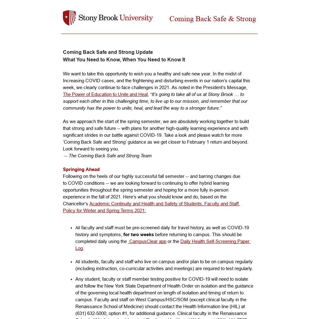 As we approach the start of the spring semester, we are absolutely working together to build that strong and safe future -- with plans for another high-quality learning experience and with significant strides in our battle against COVID-19. Take a look and please watch for more ‘Coming Back Safe and Strong’ guidance as we get closer to February 1 return and beyond. Look forward to seeing you.