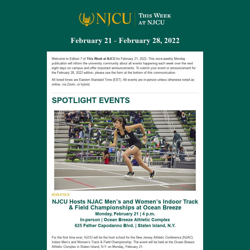 Welcome to Edition 7 of This Week at NJCU for February 21, 2022. This once-weekly Monday publication will inform the university community about all events happening each week over the next eight days on campus and offer important announcements. To submit your event or announcement for the February 28, 2022 edition, please use the form at the bottom of this communication.