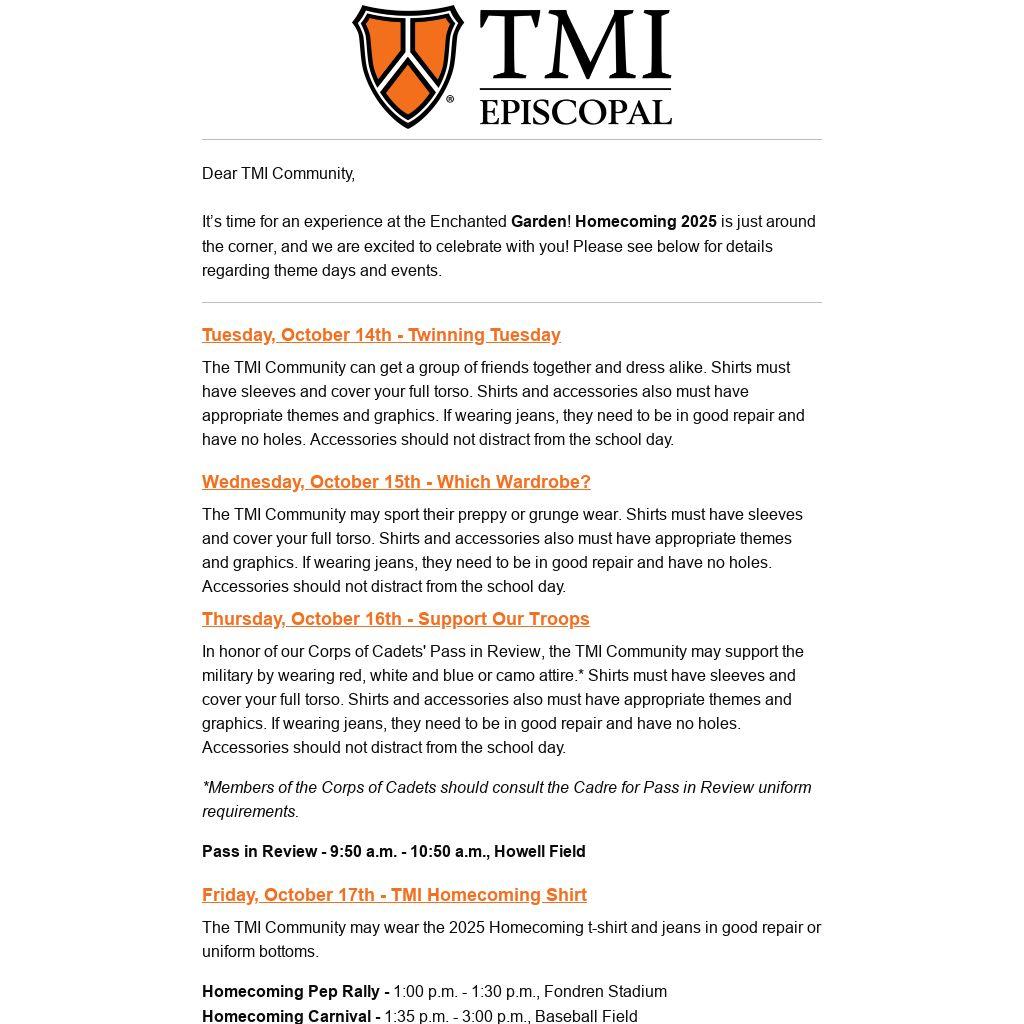 The TMI Community may wear the 2025 Homecoming t-shirt and jeans in good repair or uniform bottoms.