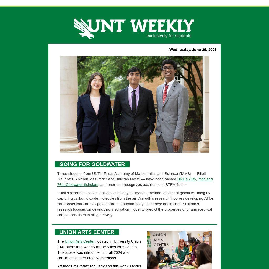 Three students from UNT’s Texas Academy of Mathematics and Science (TAMS) — Elliott Slaughter, Anirudh Mazumder and Saikiran Motati — have been named UNT’s 74th, 75th and 76th Goldwater Scholars, an honor that recognizes excellence in STEM fields.