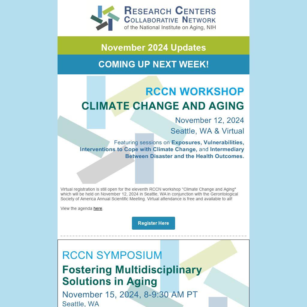 Virtual registration is still open for the eleventh RCCN workshop “Climate Change and Aging" which will be held on November 12, 2024 in Seattle, WA in conjunction with the Gerontological Society of America Annual Scientific Meeting. Virtual attendance is free and available to all!