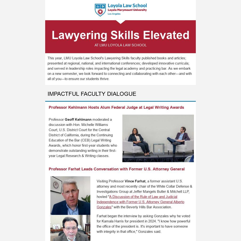 This year, LMU Loyola Law School's Lawyering Skills faculty published books and articles; presented at regional, national, and international conferences; developed innovative curricula; and served in leadership roles impacting the legal academy and practicing bar. As we embark on a new semester, we look forward to connecting and collaborating with each other—and with all of you—to ensure our students thrive.