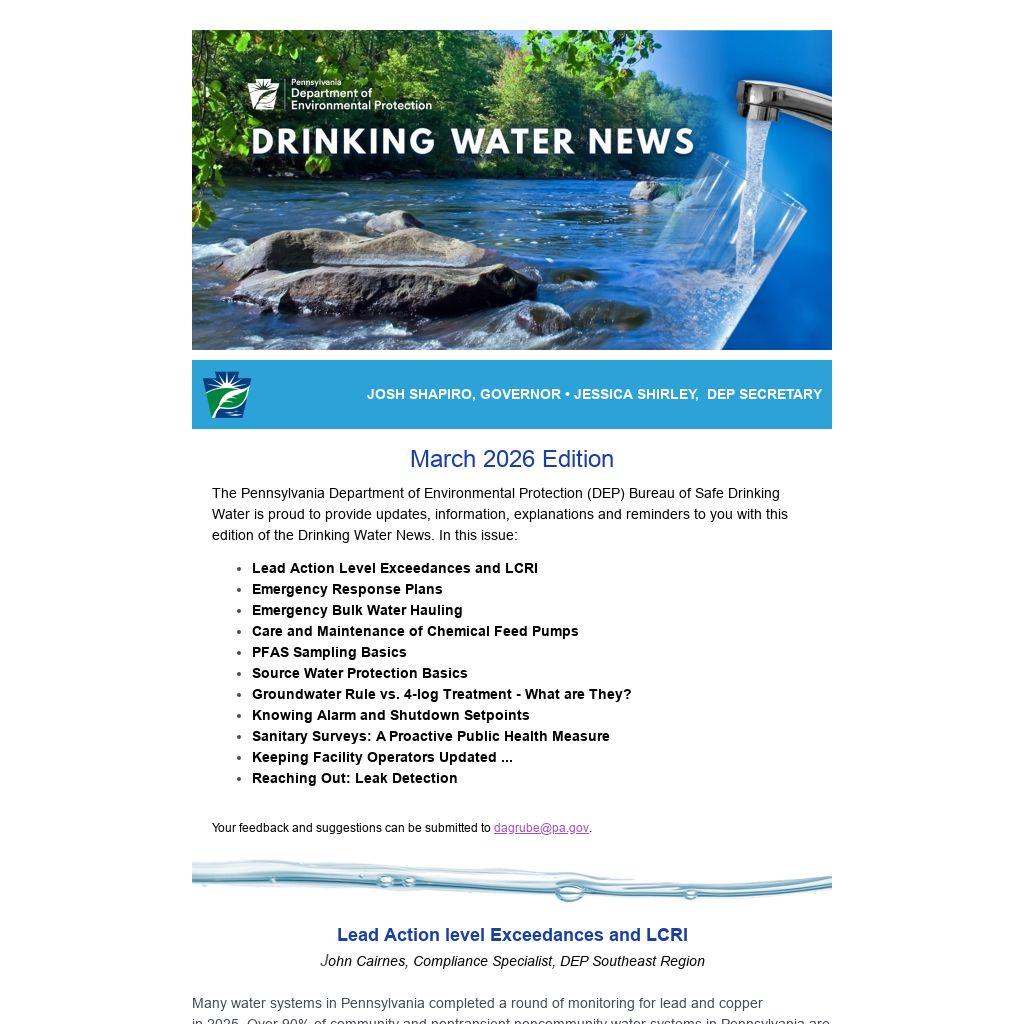 The Pennsylvania Department of Environmental Protection (DEP) Bureau of Safe Drinking Water is proud to provide updates, information, explanations and reminders to you with this edition of the Drinking Water News. In this issue: