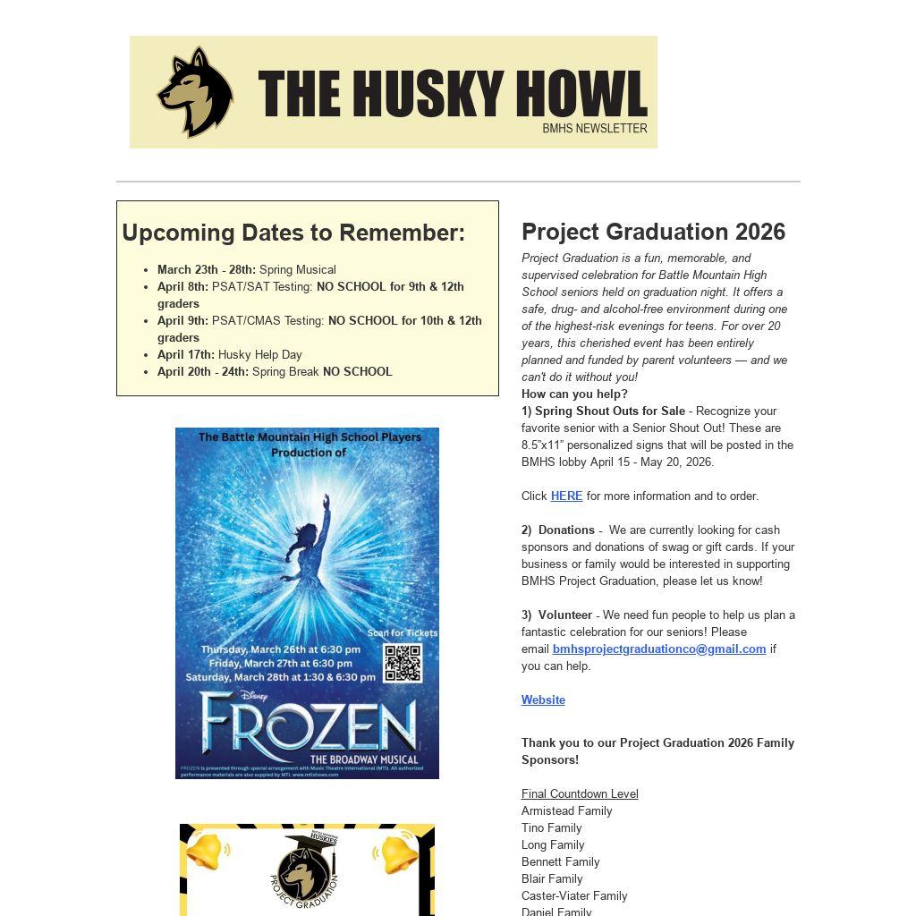 Project Graduation 2026Project Graduation is a fun, memorable, and supervised celebration for Battle Mountain High School seniors held on graduation night. It offers a safe, drug- and alcohol-free environment during one of the highest-risk evenings for teens. For over 20 years, this cherished event has been entirely planned and funded by parent volunteers — and we can't do it without you! How can you help? 1) Spring Shout Outs for Sale - Recognize your favorite senior with a Senior Shout Out! These are 8.5”x11” personalized signs that will be posted in the BMHS lobby April 15 - May 20, 2026.