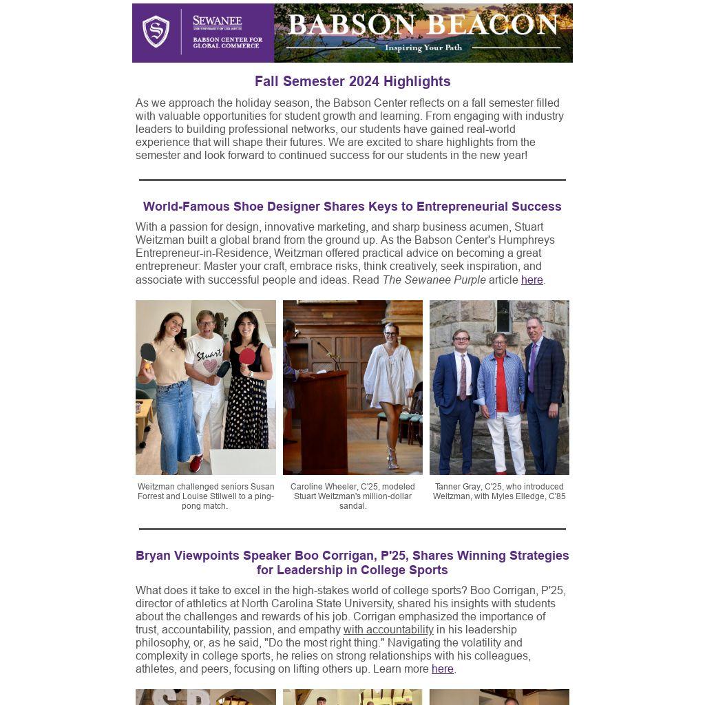 As we approach the holiday season, the Babson Center reflects on a fall semester filled with valuable opportunities for student growth and learning. From engaging with industry leaders to building professional networks, our students have gained real-world experience that will shape their futures. We are excited to share highlights from the semester and look forward to continued success for our students in the new year!