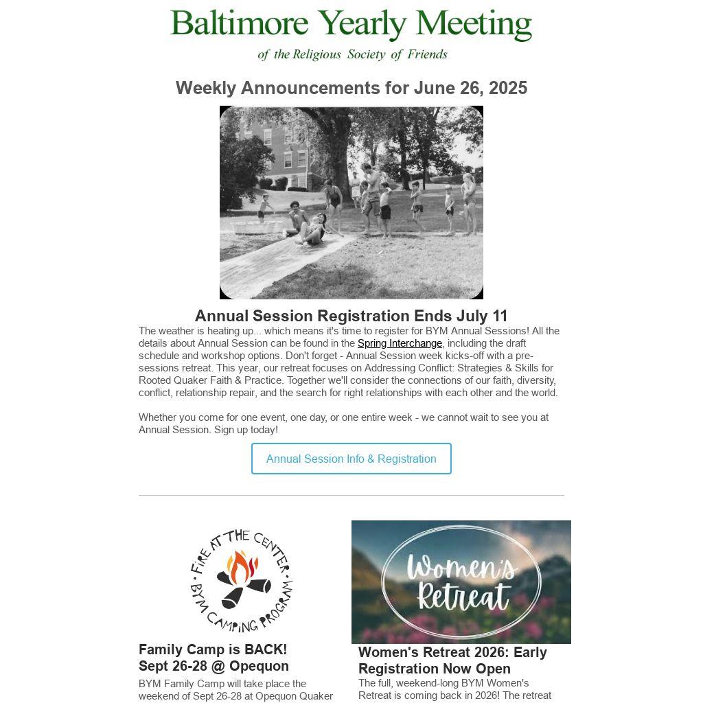 The weather is heating up... which means it's time to register for BYM Annual Sessions! All the details about Annual Session can be found in the Spring Interchange, including the draft schedule and workshop options. Don't forget - Annual Session week kicks-off with a pre-sessions retreat. This year, our retreat focuses on Addressing Conflict: Strategies & Skills for Rooted Quaker Faith & Practice. Together we'll consider the connections of our faith, diversity, conflict, relationship repair, and the search for right relationships with each other and the world.