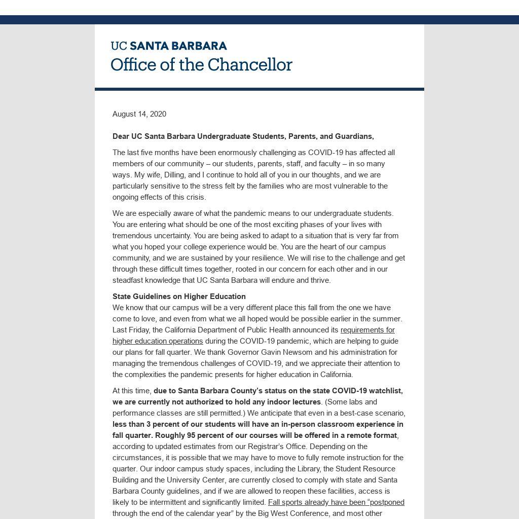 We are especially aware of what the pandemic means to our undergraduate students. You are entering what should be one of the most exciting phases of your lives with tremendous uncertainty. You are being asked to adapt to a situation that is very far from what you hoped your college experience would be. You are the heart of our campus community, and we are sustained by your resilience. We will rise to the challenge and get through these difficult times together, rooted in our concern for each other and in our steadfast knowledge that UC Santa Barbara will endure and thrive.