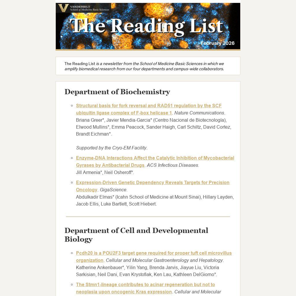 The Reading List is a newsletter from the School of Medicine Basic Sciences in which we amplify biomedical research from our four departments and campus-wide collaborators.