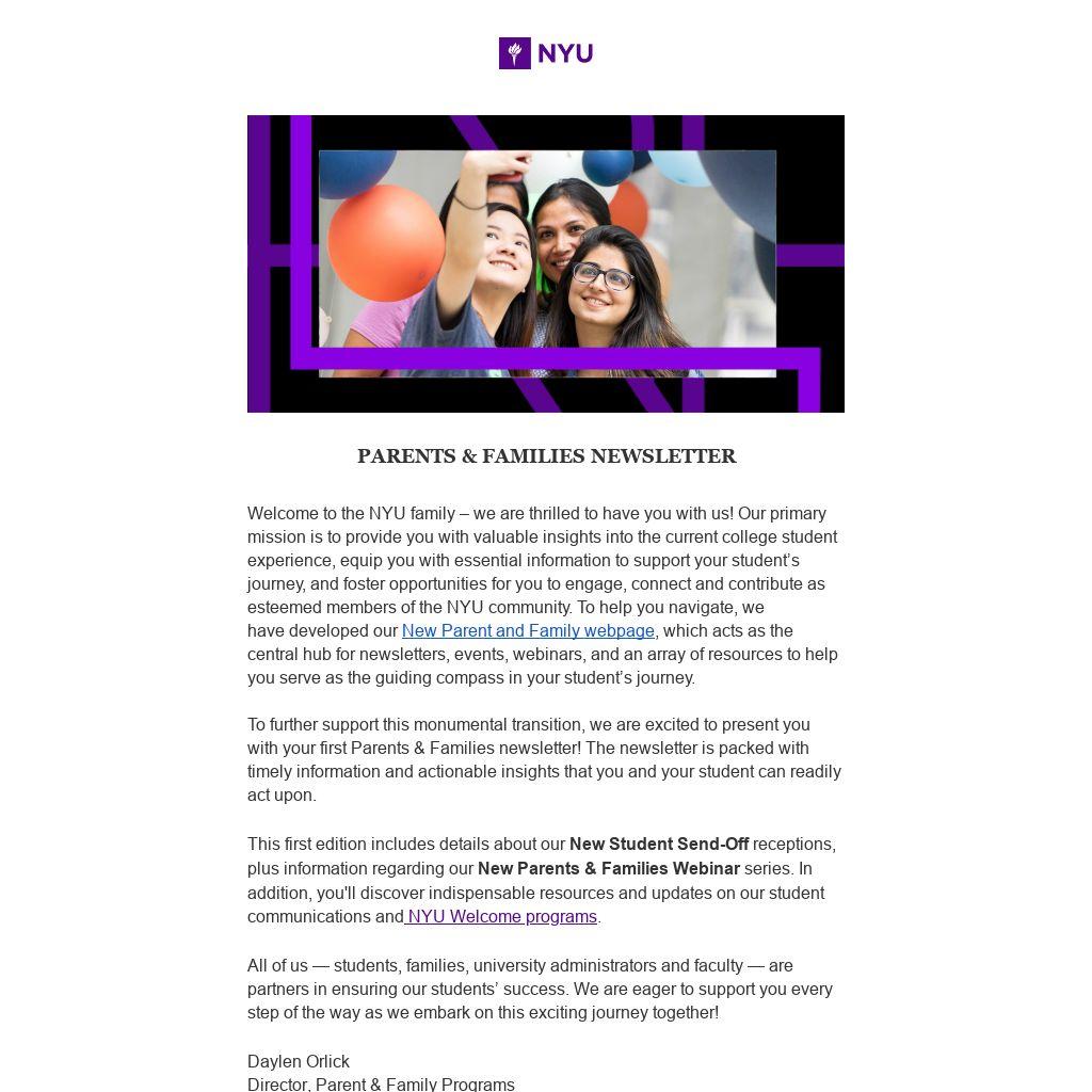 Description: Join us for an informative session designed to support both on-campus and off-campus students as they embark on their NYU journey! Delve into essential logistical details that will ensure a smooth transition during move-in day and the initial weeks of classes. From practical strategies for moving-in to navigating transportation within the city, we'll cover everything you need to know. Discover helpful tips on packing essentials, learn about transportation options, and gain insights into typical trends when sharing living spaces. Get ready to feel confident and prepared as you embark on this exciting chapter with your student!
