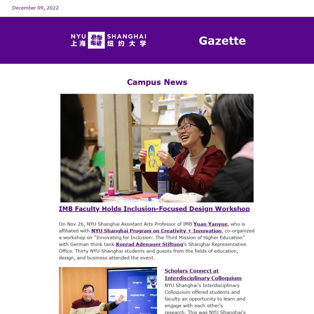 For a complete listing of events at NYU Shanghai, check out the Weekly Events Newsletter, delivered to your inbox every Monday when school is in session. If you wish to highlight your event in the Weekly Events Newsletter, upload your event to Engage no later than the Thursday before the Monday newsletter.