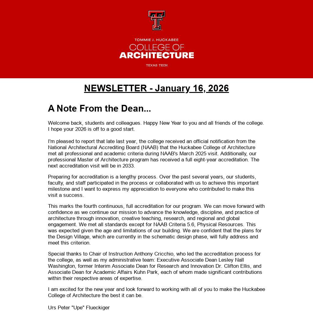 I'm pleased to report that late last year, the college received an official notification from the National Architectural Accrediting Board (NAAB) that the Huckabee College of Architecture met all professional and academic criteria during NAAB's March 2025 visit. Additionally, our professional Master of Architecture program has received a full eight-year accreditation. The next accreditation visit will be in 2033.