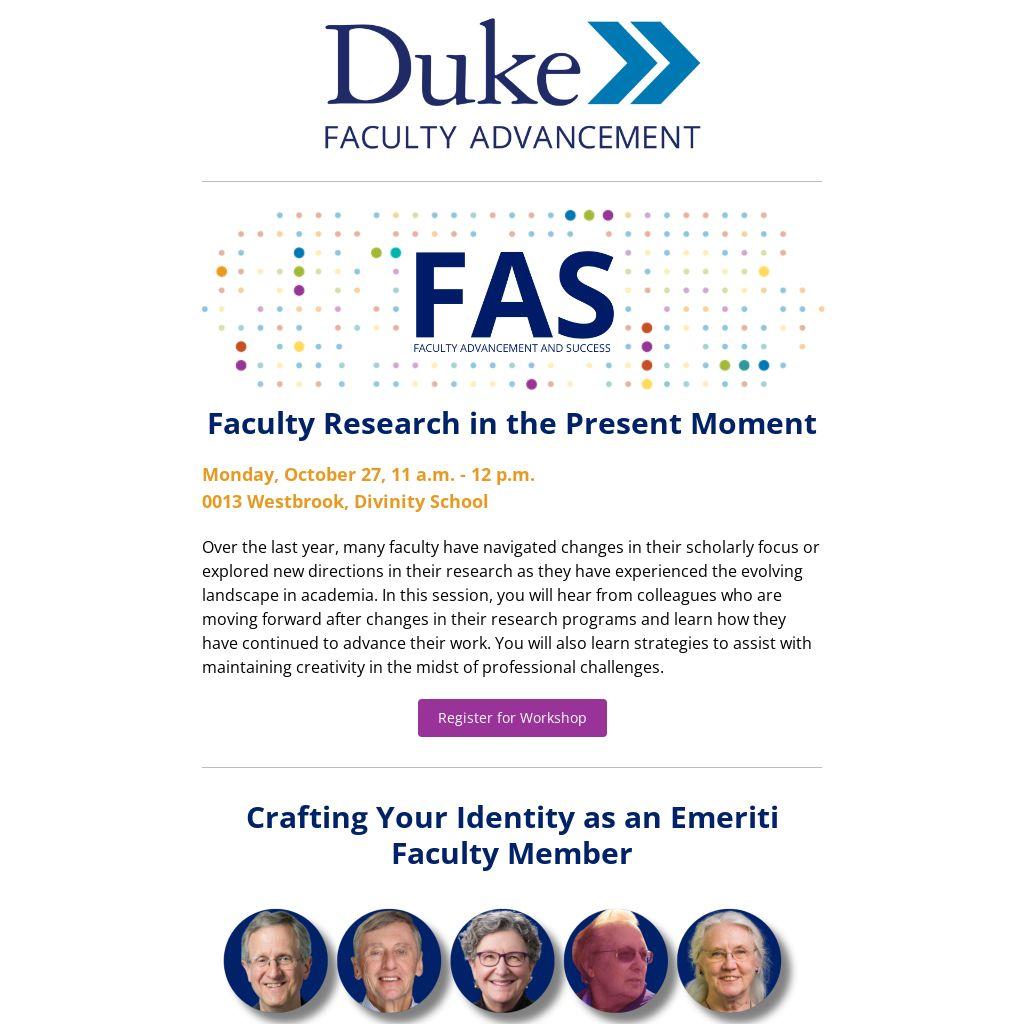 Duke Faculty Advancement helps faculty at all career stages thrive as researchers, teachers, mentors and leaders. Our university-wide programs are grounded in a holistic vision of faculty and leadership advancement that includes supporting professional growth and success, prioritizing experiences that promote a sense of community and belonging, and enriching our academic community through a range of perspectives and talents. We partner with Duke schools, departments and other academic units to recruit and retain outstanding faculty and to foster an academic environment that embodies the Duke values of respect, trust, inclusion, discovery and excellence.