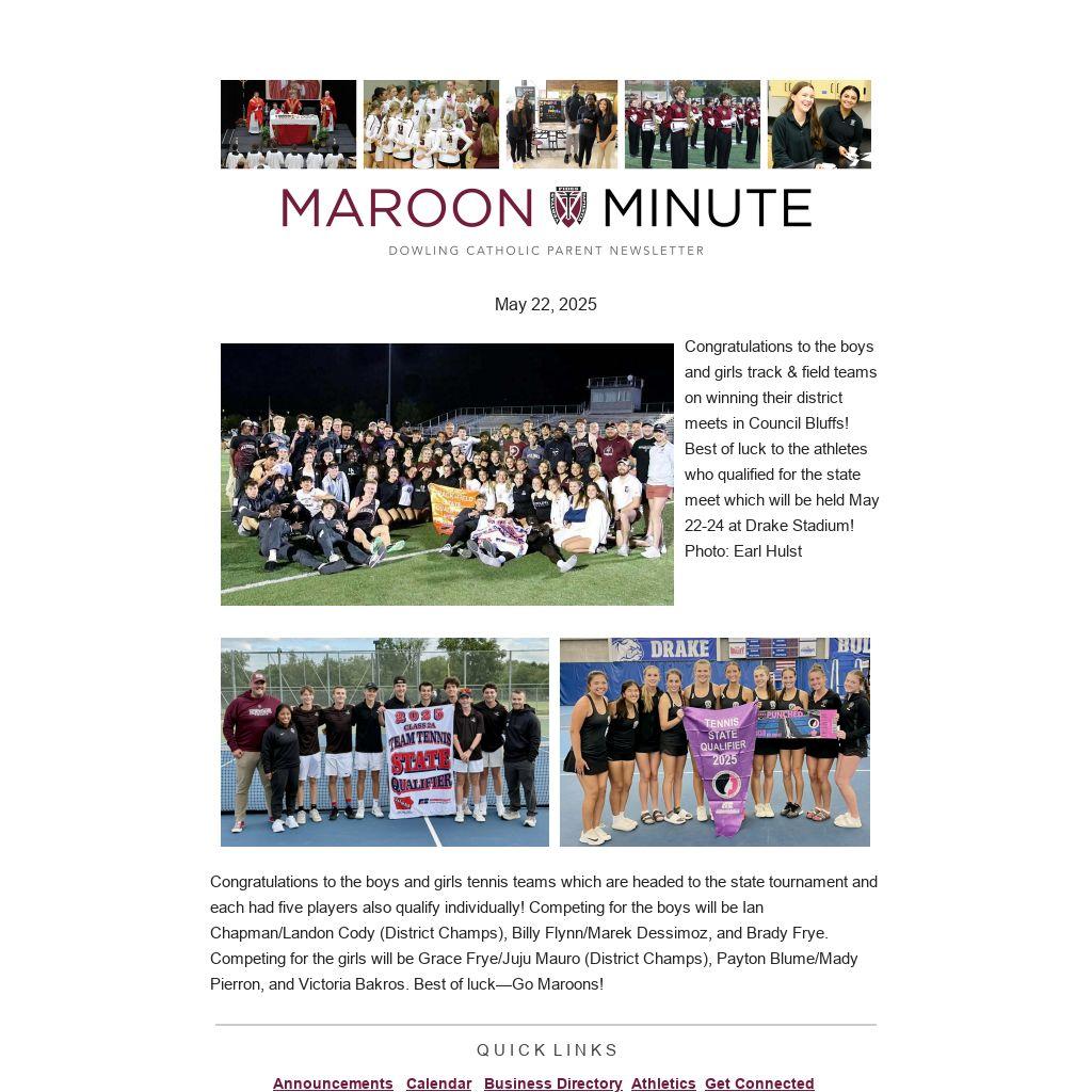 Congratulations to the boys and girls tennis teams which are headed to the state tournament and each had five players also qualify individually! Competing for the boys will be Ian Chapman/Landon Cody (District Champs), Billy Flynn/Marek Dessimoz, and Brady Frye. Competing for the girls will be Grace Frye/Juju Mauro (District Champs), Payton Blume/Mady Pierron, and Victoria Bakros. Best of luck—Go Maroons!