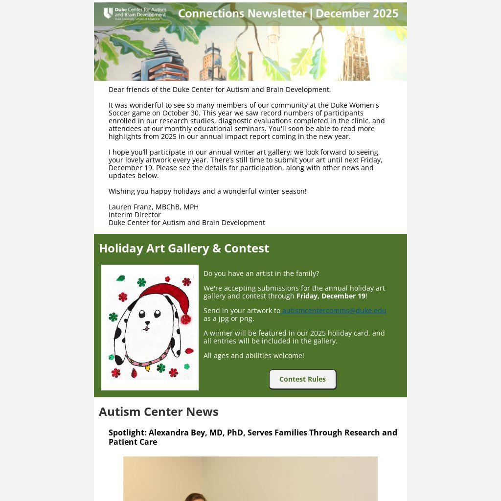 It was wonderful to see so many members of our community at the Duke Women's Soccer game on October 30. This year we saw record numbers of participants enrolled in our research studies, diagnostic evaluations completed in the clinic, and attendees at our monthly educational seminars. You'll soon be able to read more highlights from 2025 in our annual impact report coming in the new year.