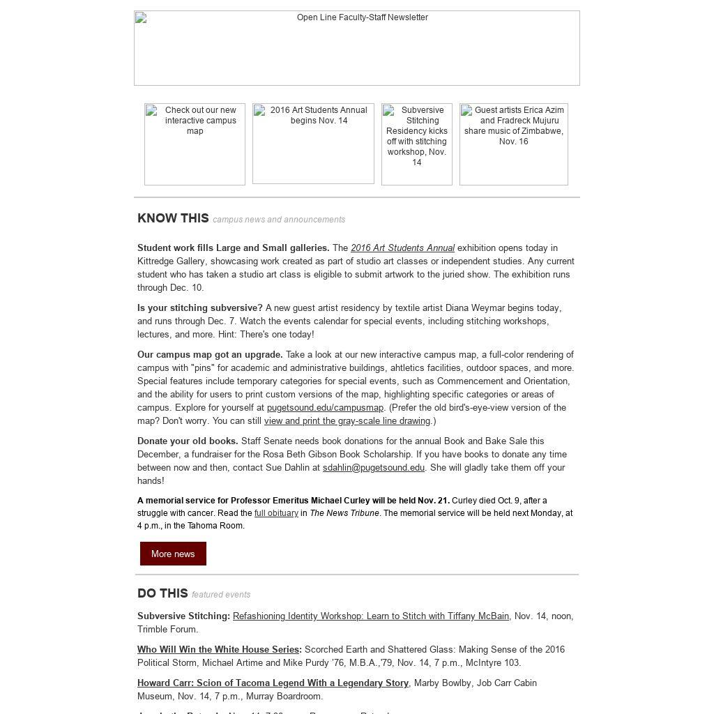 A memorial service for Professor Emeritus Michael Curley will be held Nov. 21. Curley died Oct. 9, after a struggle with cancer. Read the full obituary in The News Tribune. The memorial service will be held next Monday, at 4 p.m., in the Tahoma Room.