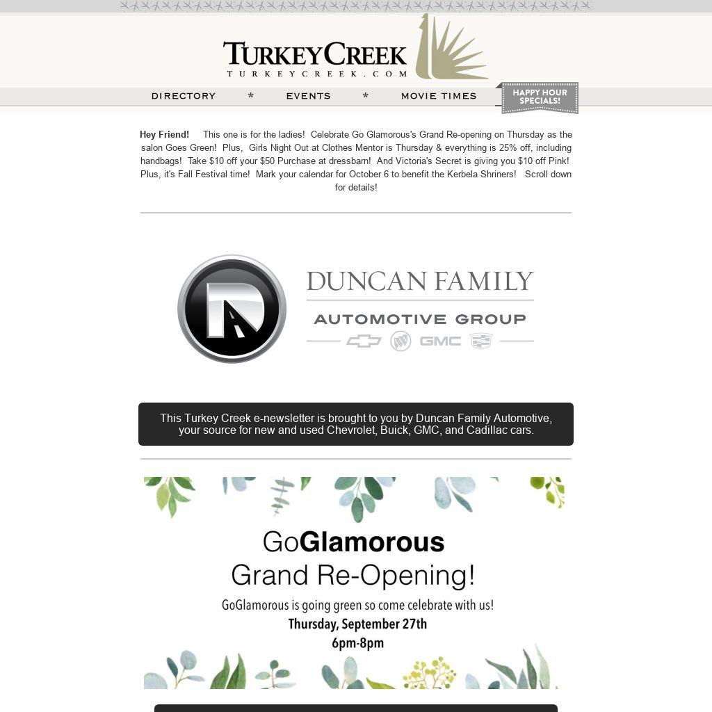 Hey Friend! This one is for the ladies! Celebrate Go Glamorous's Grand Re-opening on Thursday as the salon Goes Green! Plus, Girls Night Out at Clothes Mentor is Thursday & everything is 25% off, including handbags! Take $10 off your $50 Purchase at dressbarn! And Victoria's Secret is giving you $10 off Pink! Plus, it's Fall Festival time! Mark your calendar for October 6 to benefit the Kerbela Shriners! Scroll down for details!