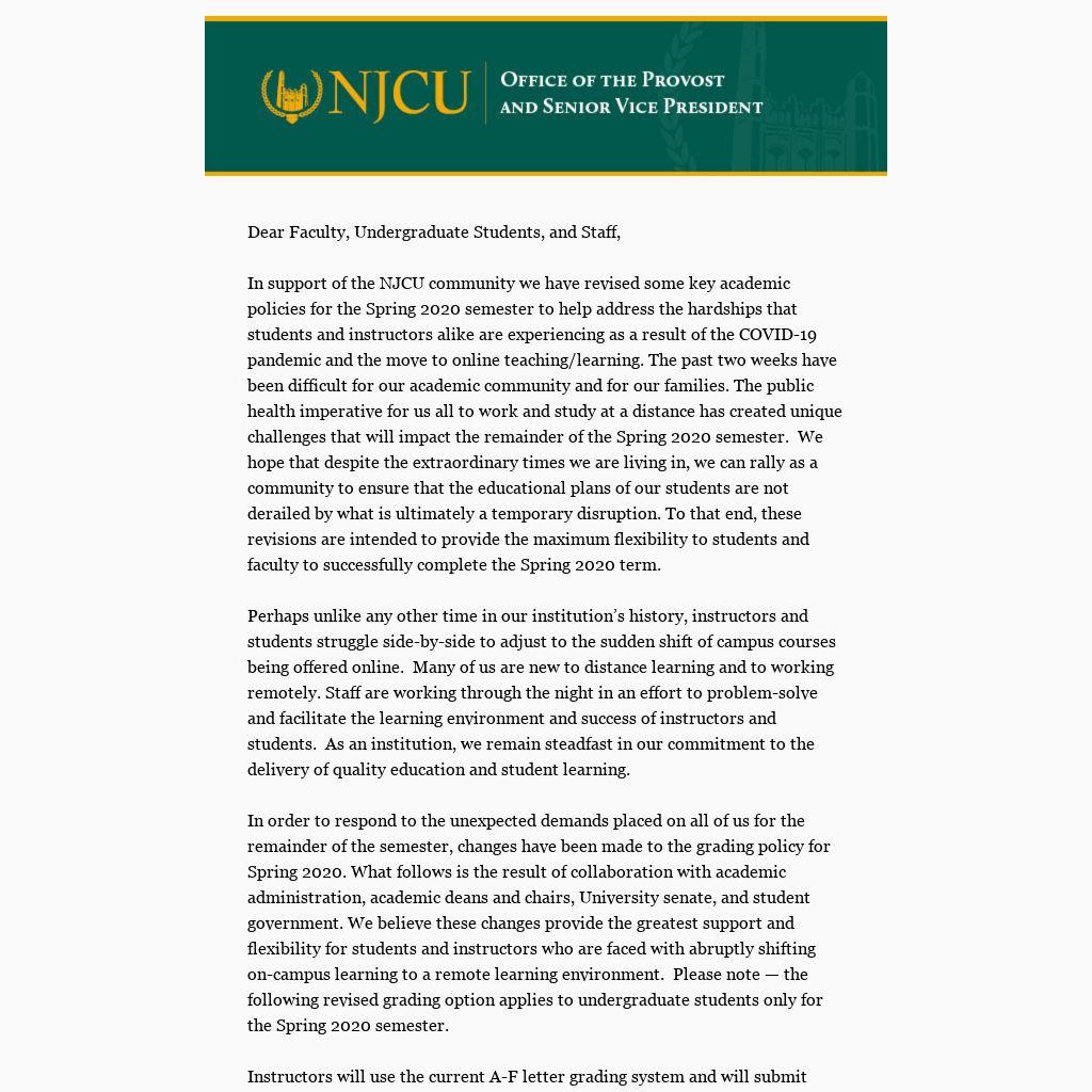 In support of the NJCU community we have revised some key academic policies for the Spring 2020 semester to help address the hardships that students and instructors alike are experiencing as a result of the COVID-19 pandemic and the move to online teaching/learning. The past two weeks have been difficult for our academic community and for our families. The public health imperative for us all to work and study at a distance has created unique challenges that will impact the remainder of the Spring 2020 semester. We hope that despite the extraordinary times we are living in, we can rally as a community to ensure that the educational plans of our students are not derailed by what is ultimately a temporary disruption. To that end, these revisions are intended to provide the maximum flexibility to students and faculty to successfully complete the Spring 2020 term.