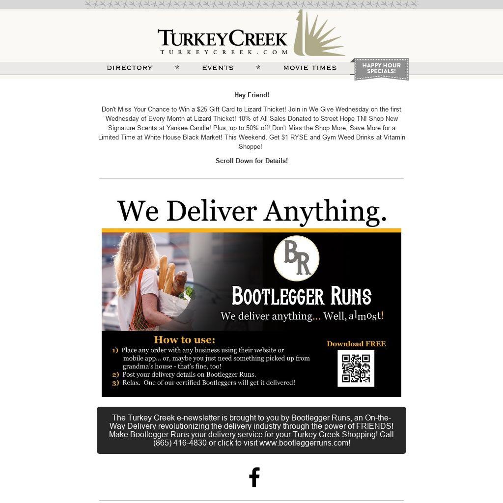 Don't Miss Your Chance to Win a $25 Gift Card to Lizard Thicket! Join in We Give Wednesday on the first Wednesday of Every Month at Lizard Thicket! 10% of All Sales Donated to Street Hope TN! Shop New Signature Scents at Yankee Candle! Plus, up to 50% off! Don't Miss the Shop More, Save More for a Limited Time at White House Black Market! This Weekend, Get $1 RYSE and Gym Weed Drinks at Vitamin Shoppe!