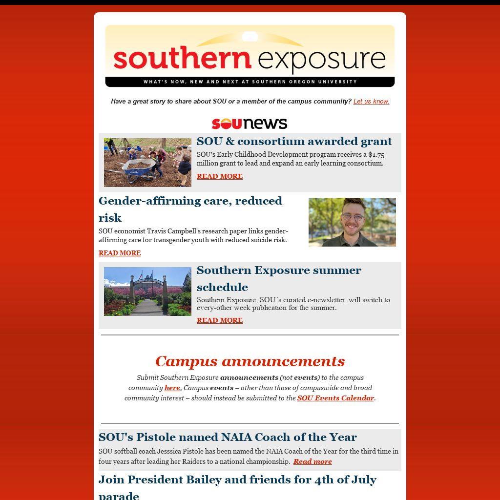 Submit Southern Exposure announcements (not events) to the campus community here. Campus events – other than those of campuswide and broad community interest – should instead be submitted to the SOU Events Calendar.