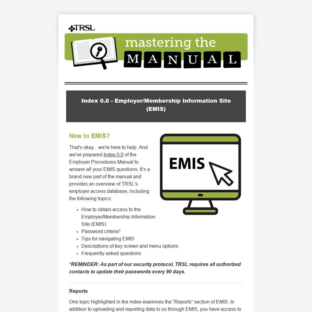 That's okay... we're here to help. And we've prepared Index 0.0 of the Employer Procedures Manual to answer all your EMIS questions. It’s a brand new part of the manual and provides an overview of TRSL’s employer access database, including the following topics: