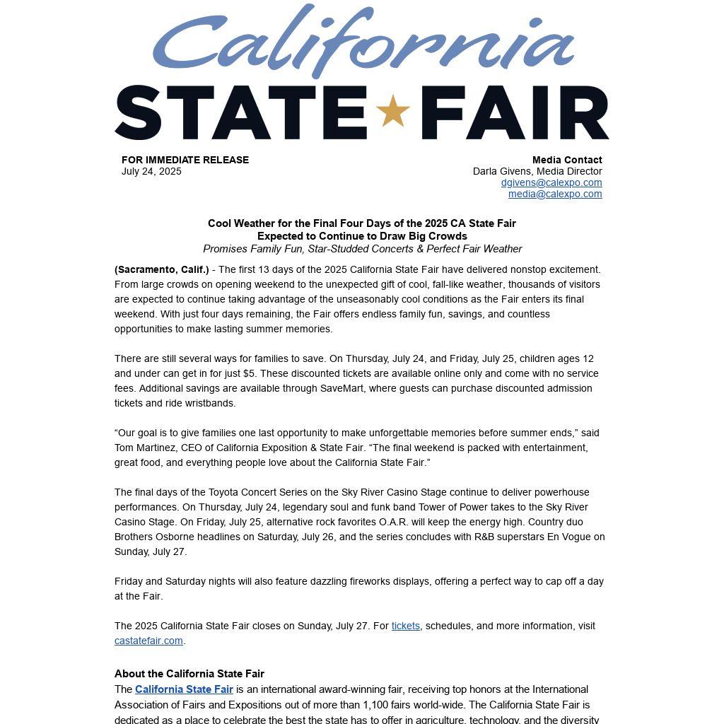 (Sacramento, Calif.) - The first 13 days of the 2025 California State Fair have delivered nonstop excitement. From large crowds on opening weekend to the unexpected gift of cool, fall-like weather, thousands of visitors are expected to continue taking advantage of the unseasonably cool conditions as the Fair enters its final weekend. With just four days remaining, the Fair offers endless family fun, savings, and countless opportunities to make lasting summer memories.
