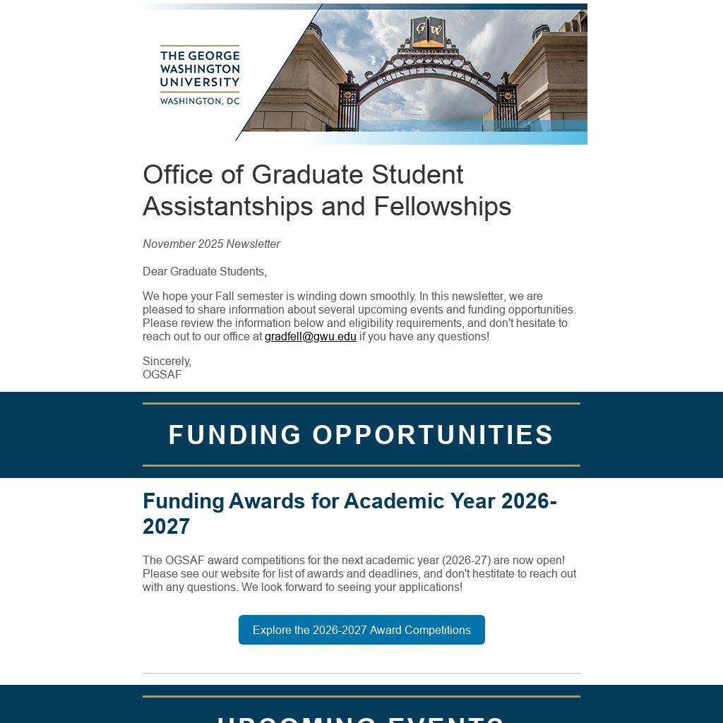 We hope your Fall semester is winding down smoothly. In this newsletter, we are pleased to share information about several upcoming events and funding opportunities. Please review the information below and eligibility requirements, and don't hesitate to reach out to our office at gradfell@gwu.edu if you have any questions!