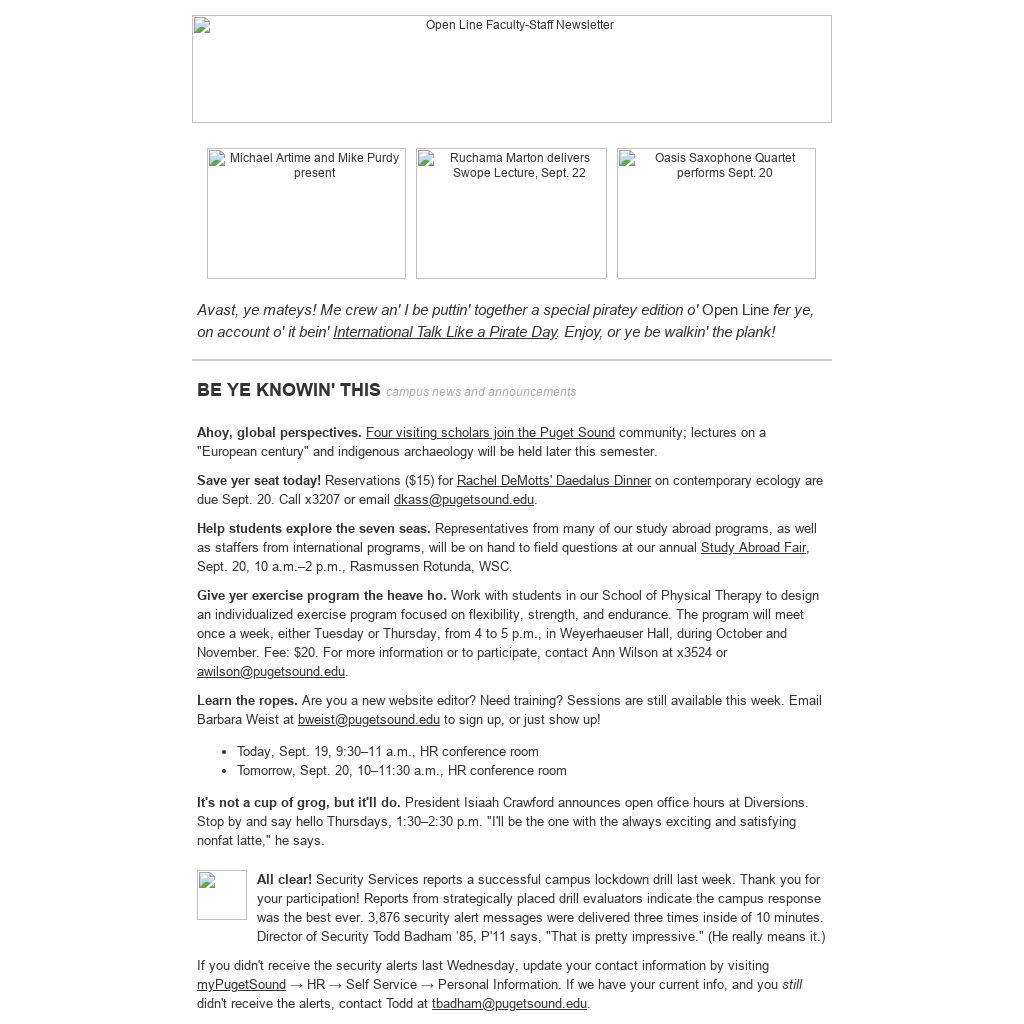 Give yer exercise program the heave ho. Work with students in our School of Physical Therapy to design an individualized exercise program focused on flexibility, strength, and endurance. The program will meet once a week, either Tuesday or Thursday, from 4 to 5 p.m., in Weyerhaeuser Hall, during October and November. Fee: $20. For more information or to participate, contact Ann Wilson at x3524 or awilson@pugetsound.edu. Learn the ropes. Are you a new website editor? Need training? Sessions are still available this week. Email Barbara Weist at bweist@pugetsound.edu to sign up, or just show up! - Today, Sept. 19, 9:30–11 a.m., HR conference room