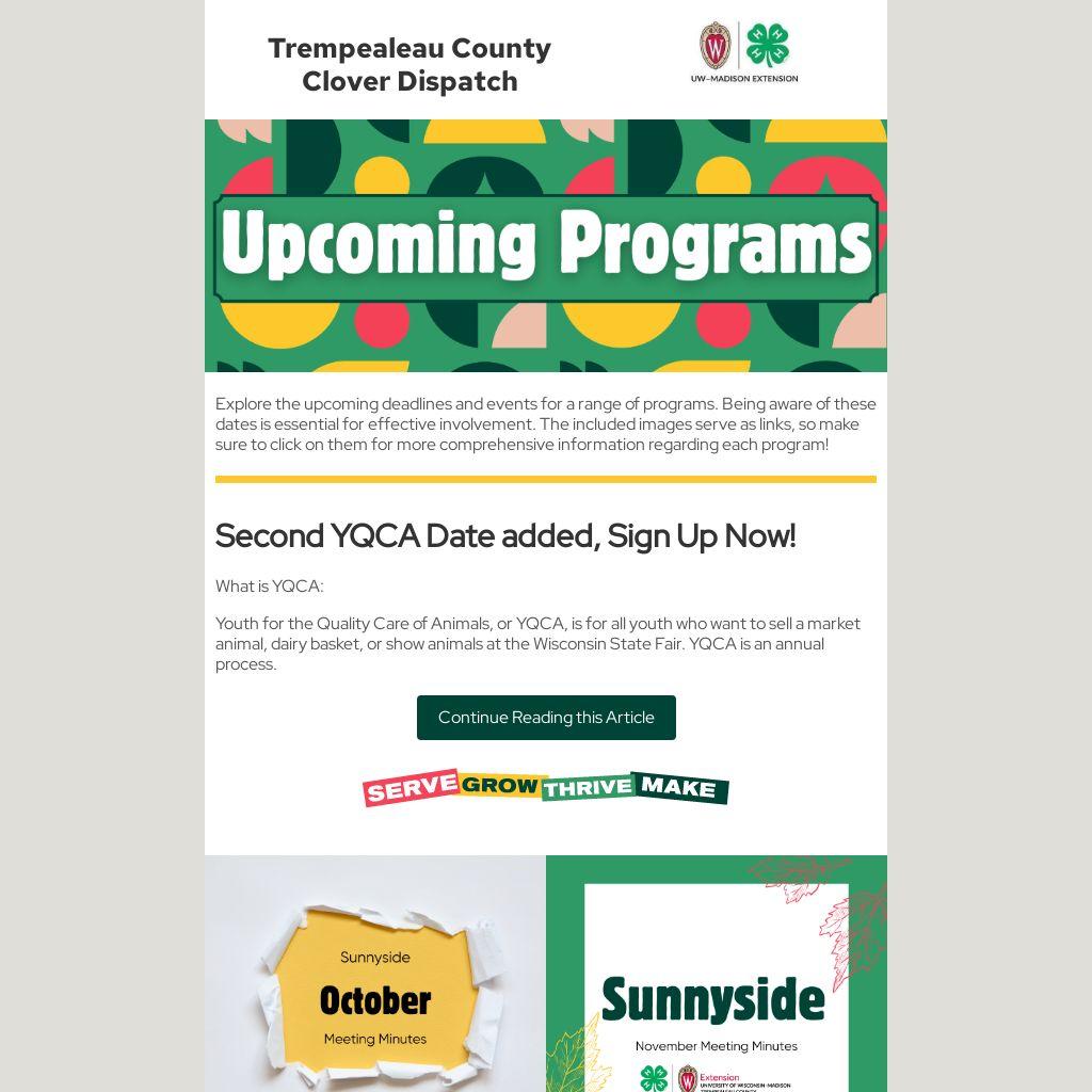 We have a new and updated calendar on our website! Check there for more information on upcoming programs and registration dates. I would love to add current club meeting times and other 4-H events to this calendar. Please email Andrea to add anything to the calendar.