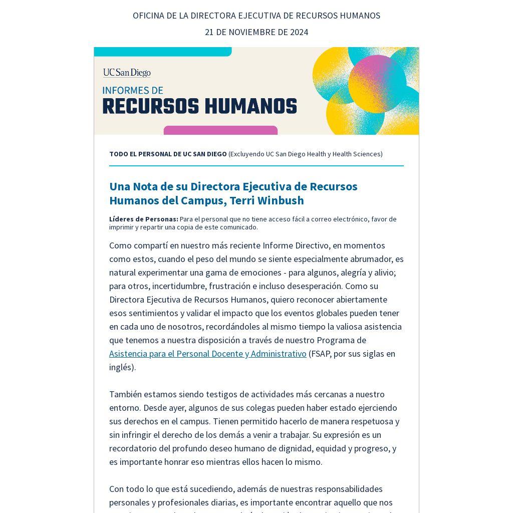 Si se perdieron nuestro Informe Directivo ayer, 20 de noviembre, pueden ver una grabación en Blink la próxima semana. Destacamos el empleo estudiantil, la planificación del campus, y discutimos actualizaciones de Recursos Humanos, la Asociación de Personal, Bienestar, y más. Asegúrense de marcar en su calendario nuestro próximo Informe Directivo, programado para el martes 4 de febrero de 2025, de 1:30 a 3 p.m. Regístrense en Zoom aquí.