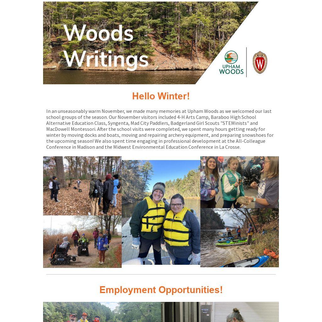 In an unseasonably warm November, we made many memories at Upham Woods as we welcomed our last school groups of the season. Our November visitors included 4-H Arts Camp, Baraboo High School Alternative Education Class, Syngenta, Mad City Paddlers, Badgerland Girl Scouts "STEMinists" and MacDowell Montessori. After the school visits were completed, we spent many hours getting ready for winter by moving docks and boats, moving and repairing archery equipment, and preparing snowshoes for the upcoming season! We also spent time engaging in professional development at the All-Colleague Conference in Madison and the Midwest Environmental Education Conference in La Crosse.