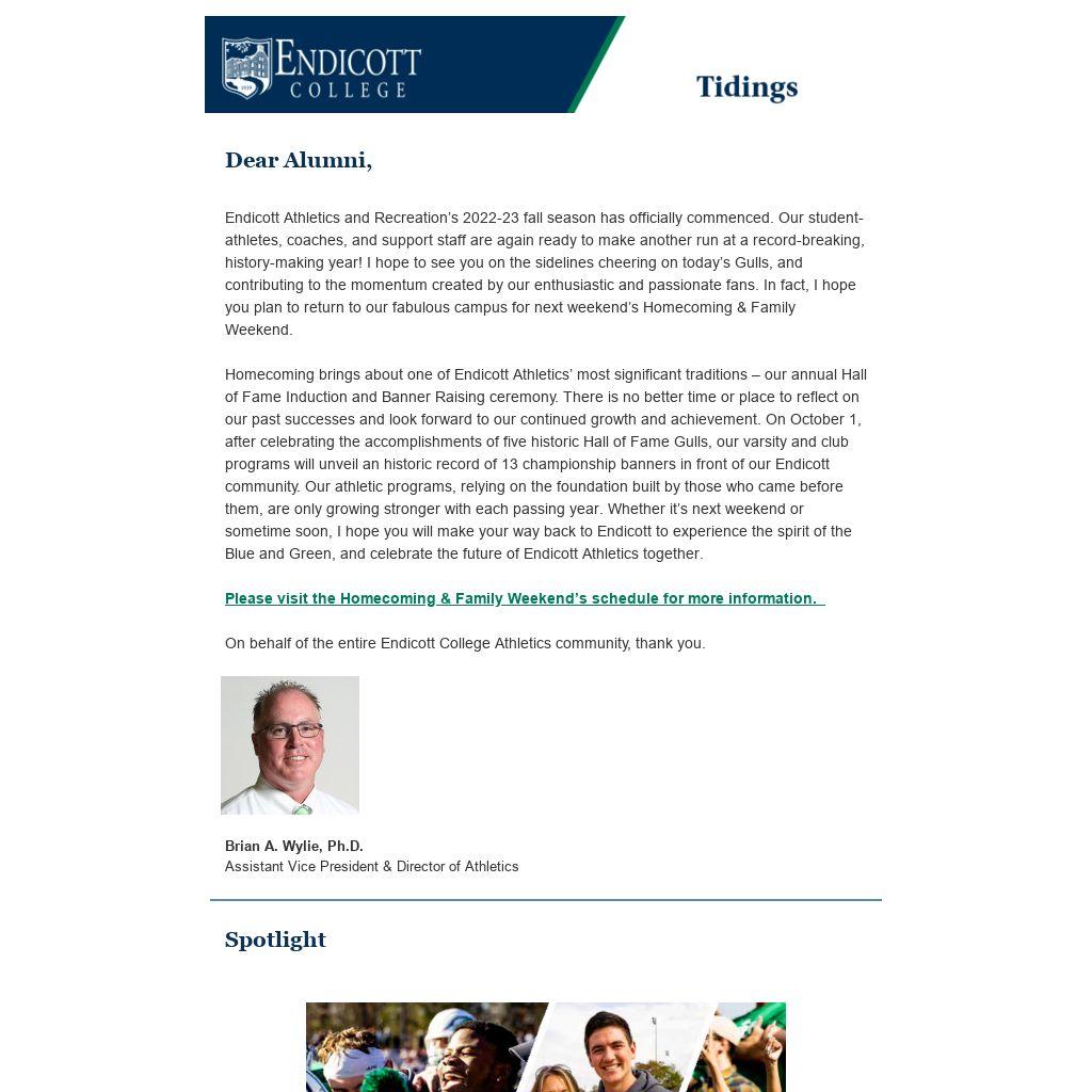 Endicott Athletics and Recreation’s 2022-23 fall season has officially commenced. Our student-athletes, coaches, and support staff are again ready to make another run at a record-breaking, history-making year! I hope to see you on the sidelines cheering on today’s Gulls, and contributing to the momentum created by our enthusiastic and passionate fans. In fact, I hope you plan to return to our fabulous campus for next weekend’s Homecoming & Family Weekend. Homecoming brings about one of Endicott Athletics’ most significant traditions – our annual Hall of Fame Induction and Banner Raising ceremony. There is no better time or place to reflect on our past successes and look forward to our continued growth and achievement. On October 1, after celebrating the accomplishments of five historic Hall of Fame Gulls, our varsity and club programs will unveil an historic record of 13 championship banners in front of our Endicott community. Our athletic programs, relying on the foundation built by those who came before them, are only growing stronger with each passing year. Whether it’s next weekend or sometime soon, I hope you will make your way back to Endicott to experience the spirit of the Blue and Green, and celebrate the future of Endicott Athletics together.