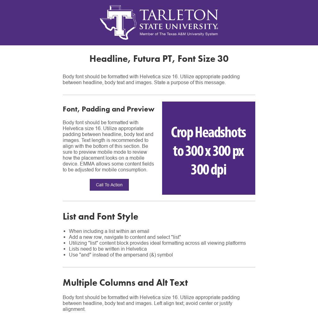 Body font should be formatted with Helvetica size 16. Utilize appropriate padding between headline, body text and images. Text length is recommended to align with the bottom of this section. Be sure to preview mobile mode to review how the placement looks on a mobile device. EMMA allows some content fields to be adjusted for mobile consumption.