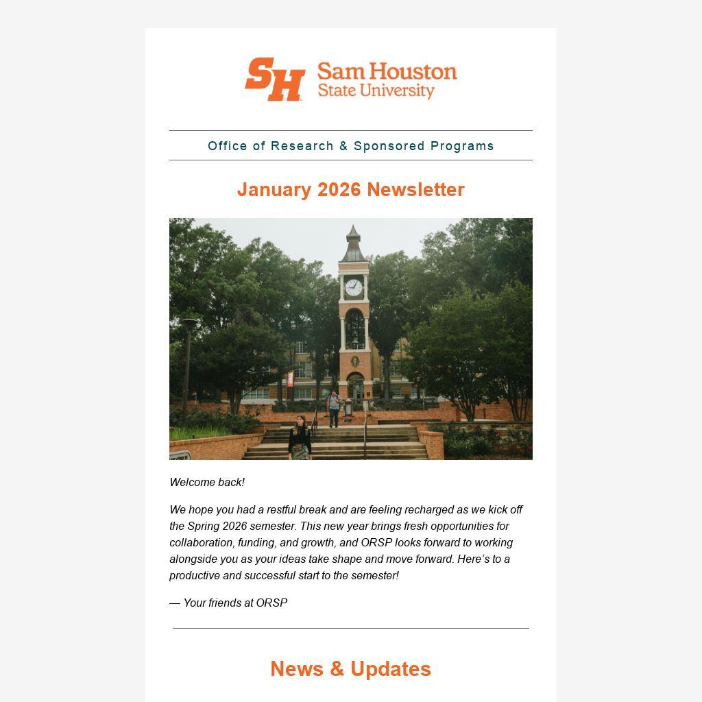 We hope you had a restful break and are feeling recharged as we kick off the Spring 2026 semester. This new year brings fresh opportunities for collaboration, funding, and growth, and ORSP looks forward to working alongside you as your ideas take shape and move forward. Here’s to a productive and successful start to the semester!