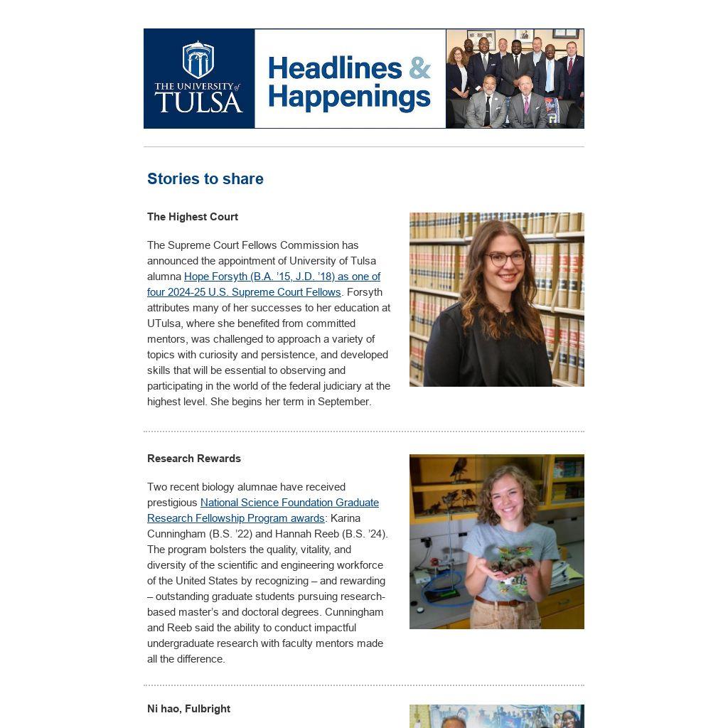 The Supreme Court Fellows Commission has announced the appointment of University of Tulsa alumna Hope Forsyth (B.A. ’15, J.D. ’18) as one of four 2024-25 U.S. Supreme Court Fellows. Forsyth attributes many of her successes to her education at UTulsa, where she benefited from committed mentors, was challenged to approach a variety of topics with curiosity and persistence, and developed skills that will be essential to observing and participating in the world of the federal judiciary at the highest level. She begins her term in September.