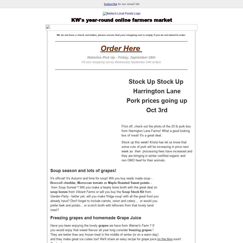 | We do not have a check out button, please ensure that your shopping cart is empty if you do not intend to order. Order Here Waterloo Pick Up - Friday, September 26th